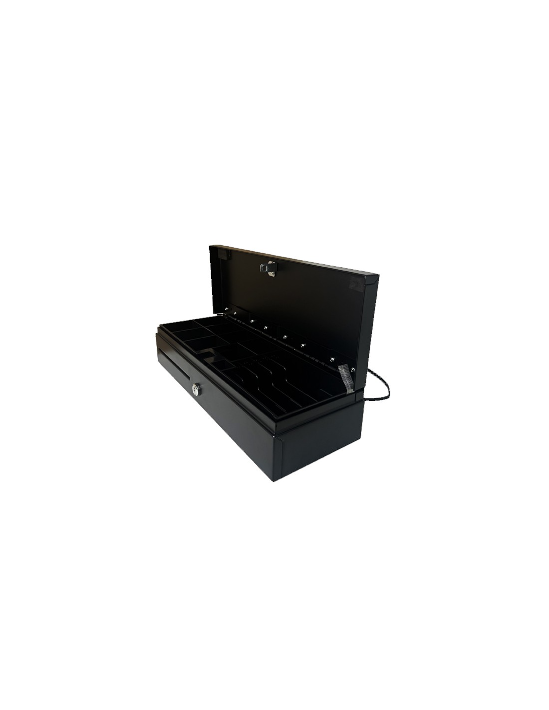 Cajón portamonedas automático de apertura vertical 46cm, 6 compartimentos para billetes, 8 gavetas para monedas, RJ12, 24V, negro.